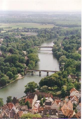 in die Donau. Man kann schon aus der Ferne den Turm des Ulmer Münsters -mit