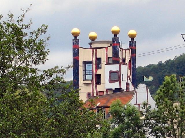 Hundertwasser-Regenturm in Richtung Stadtmitte. Am Marktplatz. dem