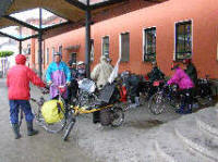 Am Bahnhofvorplatz machten wir uns wasserfest. Die Regenbekleidung sollte