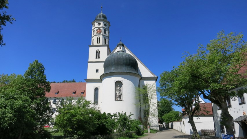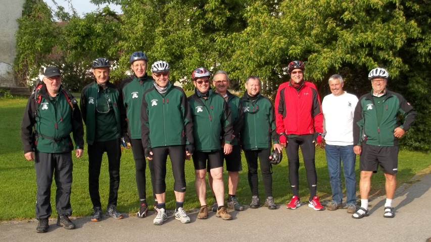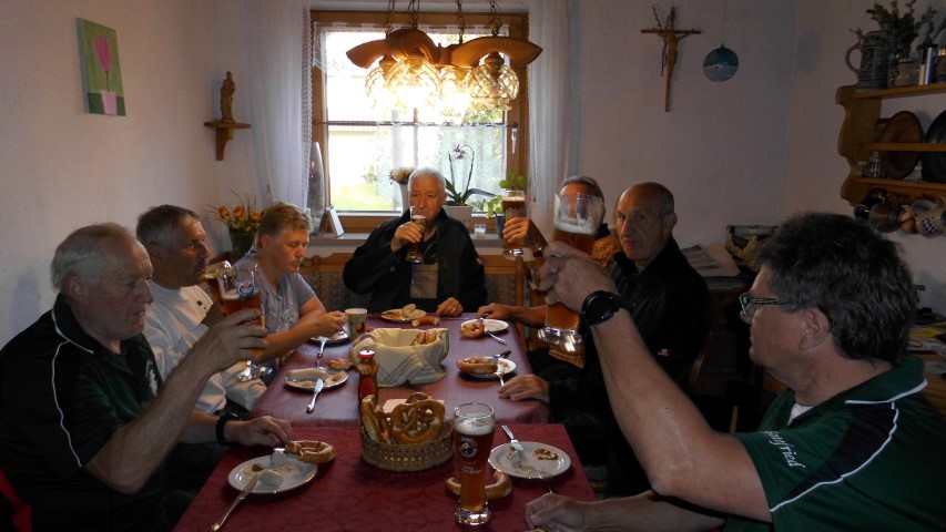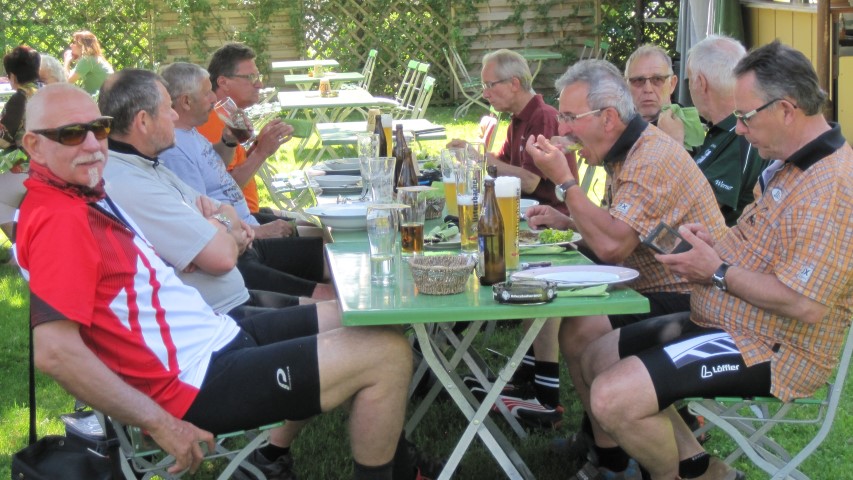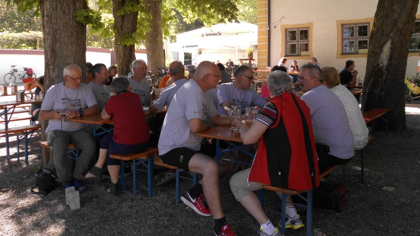 Samstag 27.05.2017: Wie schon gestern gab's um 7.30 Uhr Frühstück. Um 8.30 Uhr kamen ein Überraschungsgast. Toni (Anton aus Leuthau) kam zu uns nach Donauwörth. Er wollte unbedingt, wenigsten die letzte Etappe, per eBike (Pedelec) mit uns nach Hause radeln. Nach der herzlichen Begrüßung von Toni, Floh und dem kleinem Leon fuhren wir dann gegen 9 Uhr los. Über Meitingen, Druisheim, Allmannshofen, Blankenburg und Markt erreichten wir Biberbach. Hier besichtigten wir die Klosterkirche und fuhren dann über Achsheim nach Gablingen. Im Biergarten des Gasthofes Hartl wartete bereits unserer zweiter Überraschungsgast. Pit war gekommen um mit uns gemeinsam Mittag zu essen und alles vom bisherigen Tourverlauf zu erfahren. Auch er konnte leider wegen Hüftproblemen nicht an der Tour teilnehmen. Gegen 14.15 Uhr brachen wir zum letzten Teilstück unserer Staudenradlertour auf. Bereits eine Stunde früher (16 Uhr) als geplant erreichten wir unser Ziel, den Biergarten des Klosterstübles in Oberschönenfeld. Hier gesellten sich dann auch einige unserer Frauen dazu um uns nach unserer sturz- und unfallfreien Tour zu begrüßen. Wir machten gemeinsam Brotzeit, tranken ein letztes Bier, dann ging's heim. (Teilstrecke 56 km) Donauwörth bis Oberschönenfeld