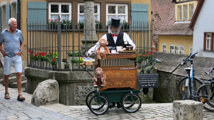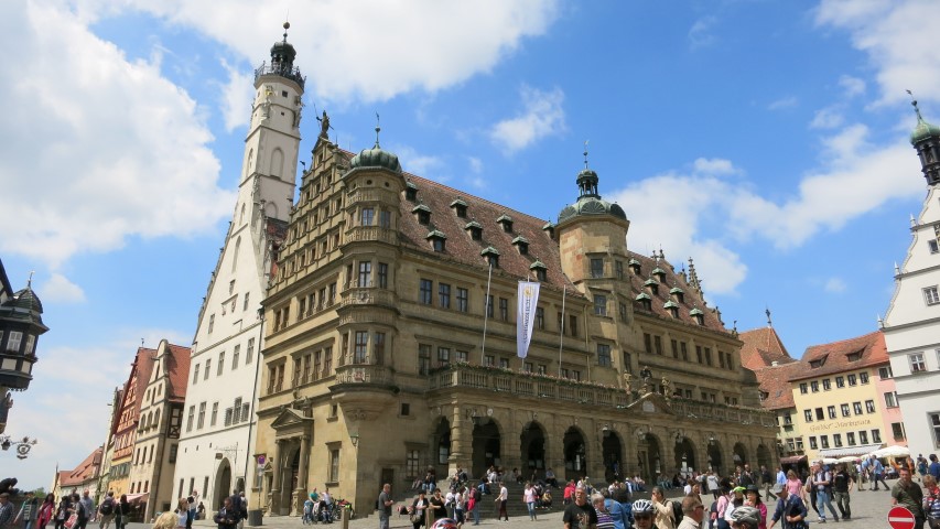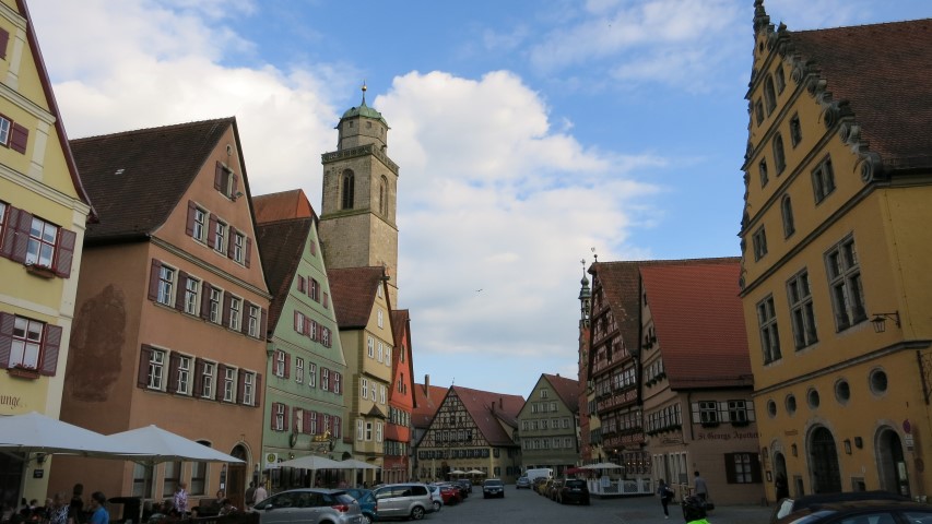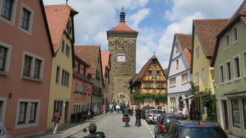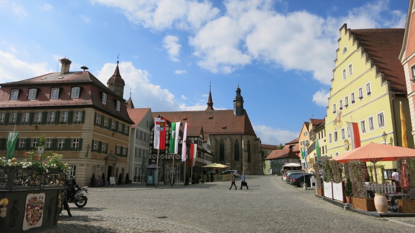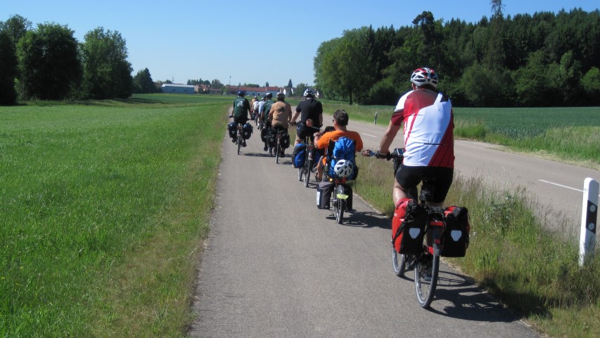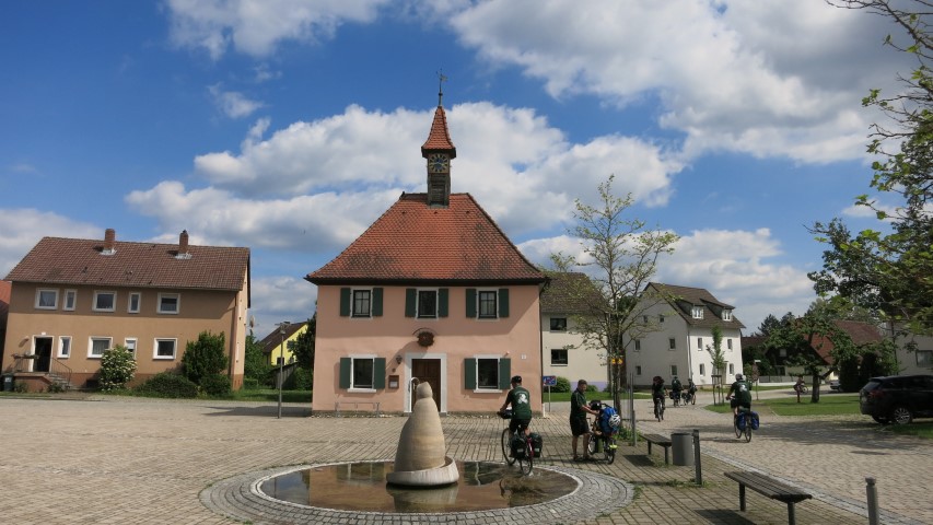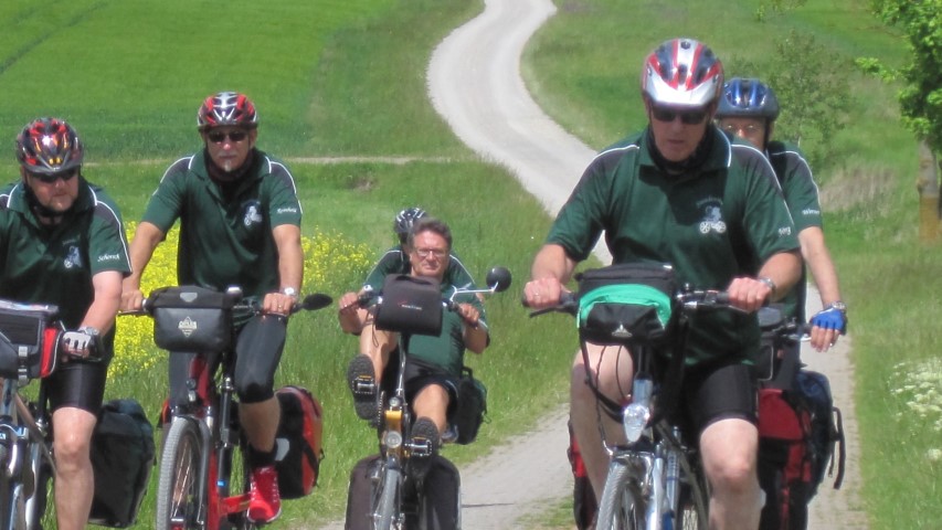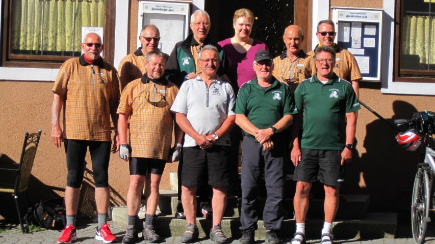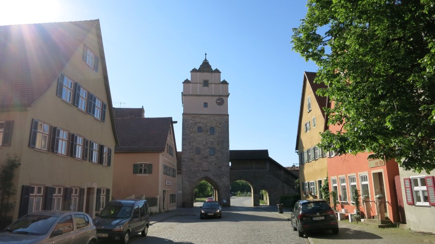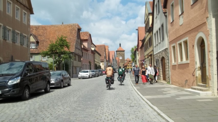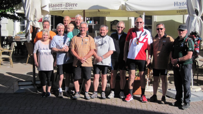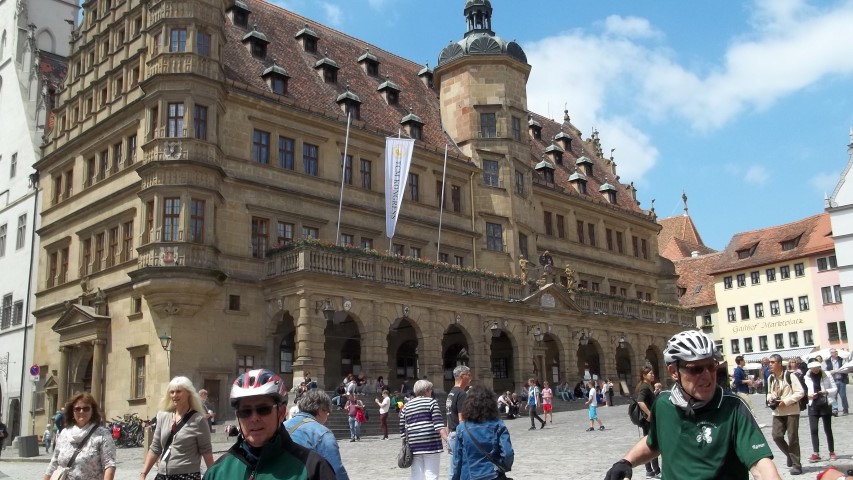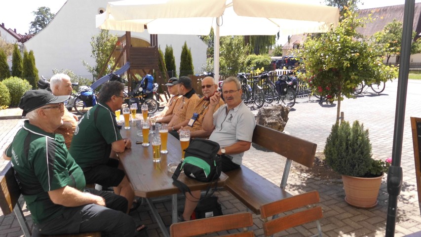Donnerstag 25.05.2017: Gegen 7 Uhr trafen sich die Staudenradler beim Manager. Auch Toni (Anton aus Leuthau) war hier, obwohl er leider nicht mitfahren konnte. Seine Hüft-OP rückt näher und er will kein Risiko eingehen. Gut gestärkt wurde noch ein Gruppenfoto gemacht und dann ging's um 7.50 Uhr los zum Bahnhof in Gessertshausen. Abfahrt war (sollte sein) 7.45 Uhr. Leider fuhr er verspätet ab und kam folge dessen auch in Augsburg-Oberhausen verspätet an. Unser Anschlusszug Richtung Treuchtlingen war bereits abgefahren. Jetzt konnten wir 2 Stunden Zeit "totschlagen" bis zur nächsten Fahrtmöglichkeit. Karl schlug vor der Wertach entlang zur Kupferhütte zu radeln. Ein kurzer Frühschoppen könnte nicht schaden. Doch wir wurden enttäuscht, es gab noch keinen Ausschank und nichts zu Essen. Also mussten wir zurück zum Augsburger Hauptbahnhof. Die Zeit sollte noch für ein Bierchen reichen. 10.28 Uhr gings dann pünktlich von Gleis 5 dann endlich los. Dann Umsteigen in Treuchtlingen (5 Minuten) und in Steinach (4 Minuten) ging "Gott sei Dank" problemlos über die Bühne. Die Fahrt im Zug konnten wir allerdings nur in kleinen Gruppen durchführen. Doch interessante Unterhaltungen mit anderen Radlern ließ die Bahnfahrt erträglich werden. Es waren auffallend viele Damen-Radler-Gruppen unterwegs. Gegen 13 Uhr kamen wir endlich in Rothenburg o.d. Tauber an. Vom Bahnhof aus machten wir noch eine kleine Runde zur Innenstadt von Rothenburg. 13.45 Uhr war dann endlich "Startschuss" für unsere 29. Tour "Romantische Straße". Nach einigen knackigen Steigungen über Gebsattel, Diebach, Schillingsfürst und Dombühl machten wir gegen 16.45 Uhr Pause in Feuchtwangen. Danach radelten wir weiter über Schopfloch nach Dinkelsbühl. Übernachtung im Hotel – Restaurant „Fränkischer Hof“, www.fr-hof.de. Gegen 19 Uhr kamen wir hier an. Jetzt war wieder, wie immer, Zimmerverteilung und Duschen angesagt. Anschließend gab's Abendessen und gemütliches beisammensitzen. Erstmals gingen alle zur selben Zeit (23.15 Uhr) auf ihre Zimmer. (Teilstrecke 52 km) Rothenburg bis Dinkelsbühl