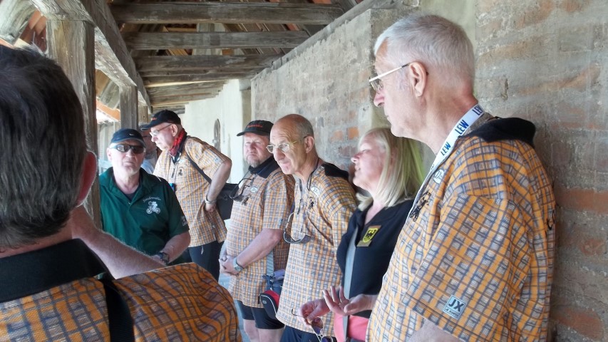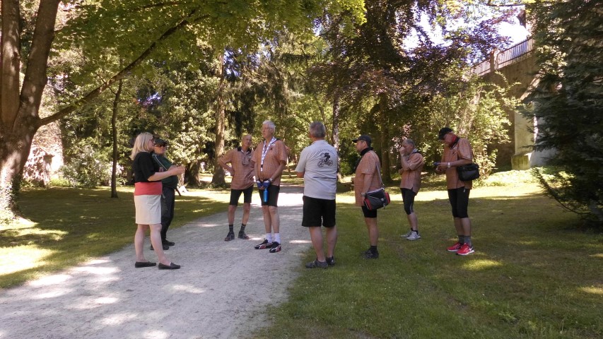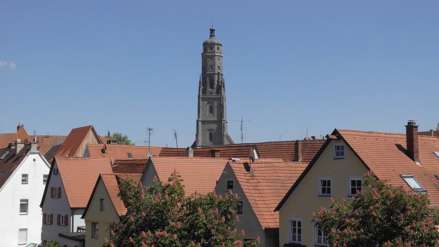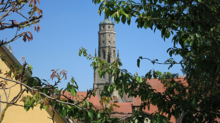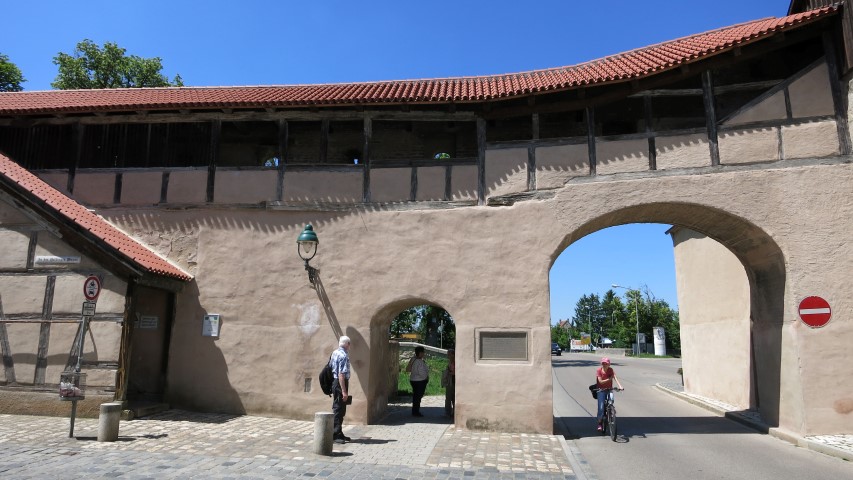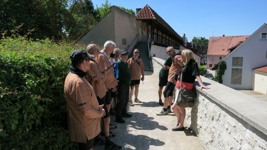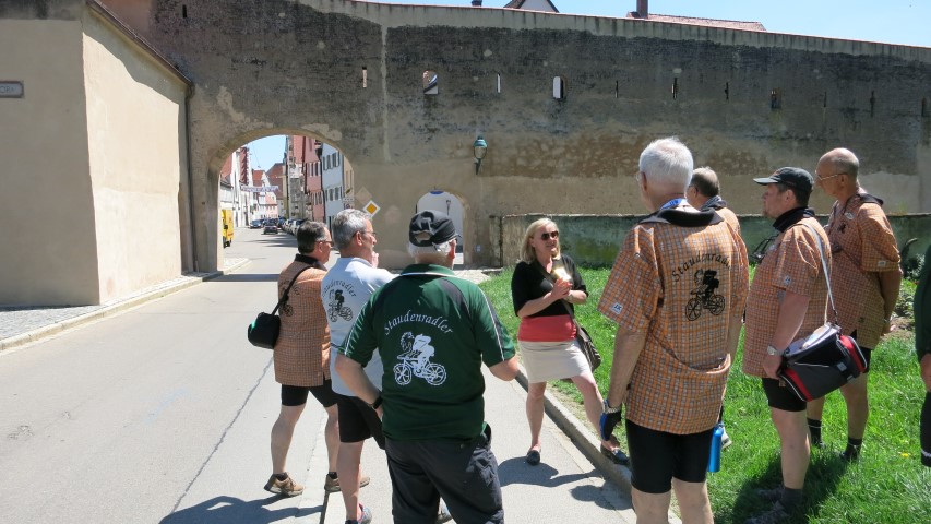 Freitag 26.05.2017: 7.30 Uhr war unser gemeinsames Frühstück mit einem reichhaltigen Buffett. 8.45 Uhr ging's dann wieder los. Natürlich erst nach unserem gemeinsamen Foto vor der Unterkunft. Auch heute waren wieder einige Steigungen zu überwinden. Über Fremdingen (hier wollten Norbert, Werner und Gottfried ihren neuen Pfarrer besuchen, leider waren nur die nette Pfarrköchin und Sekretärin zu Hause) kamen wir nach Maihingen. Hier besichtigten wir die Klosterkirche und zündeten Kerzen. Im danebenliegenden Biergarten machten wir Mittagspause. Anschließend fuhren wir weiter über Wallerstein nach Nördlingen. Dort hatten wir eine Stadtmauerführung gebucht. Frau Bauer erzählte uns viel Wissenswertes und Interessantes über die 2,6 km lange Mauer.