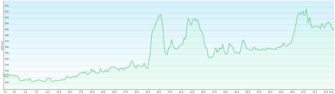 Durchschnitt in Fahrt: 17,9 km/h Max.: 527 m Absti eg: 497 m